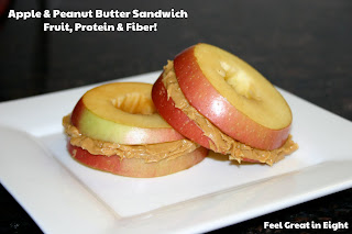This is a super simple one to make, all you need is an apple and some 100% natural peanut butter (creamy or crunchy is fine). Just slice the apple from side to side into 1/2 inch circles. You should be able to get 4 circles out of one apple. Then just cut out the core either with an apple corer, a circle cookie cutter or by hand. Spread 1 one piece with 1 tablespoon peanut butter and top with another piece. If you are making them ahead of time, just rub the exposed apple flesh with a little lemon juice. YUM!